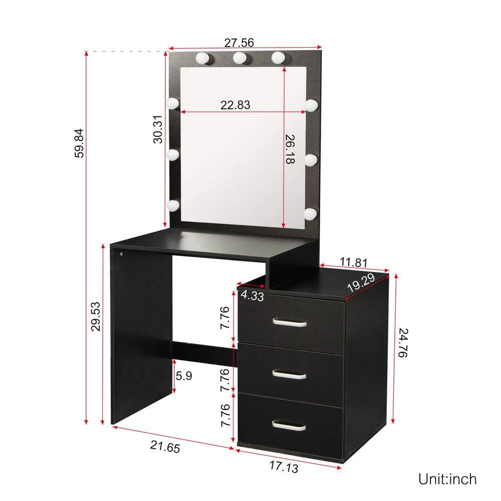Our dresser comes with 3 drawers and a spacious table top, and 1-mirror with 9 LED lights. 9-LED light providing three different light colors: warm light/natural light/cold light, you can adjust the brightness according to the environment. The 3 large drawers are designed to meet your space.needs for, organizing makeup, jewelry and accessories. So Buy a fancy dresser to make your room look even more beautiful.