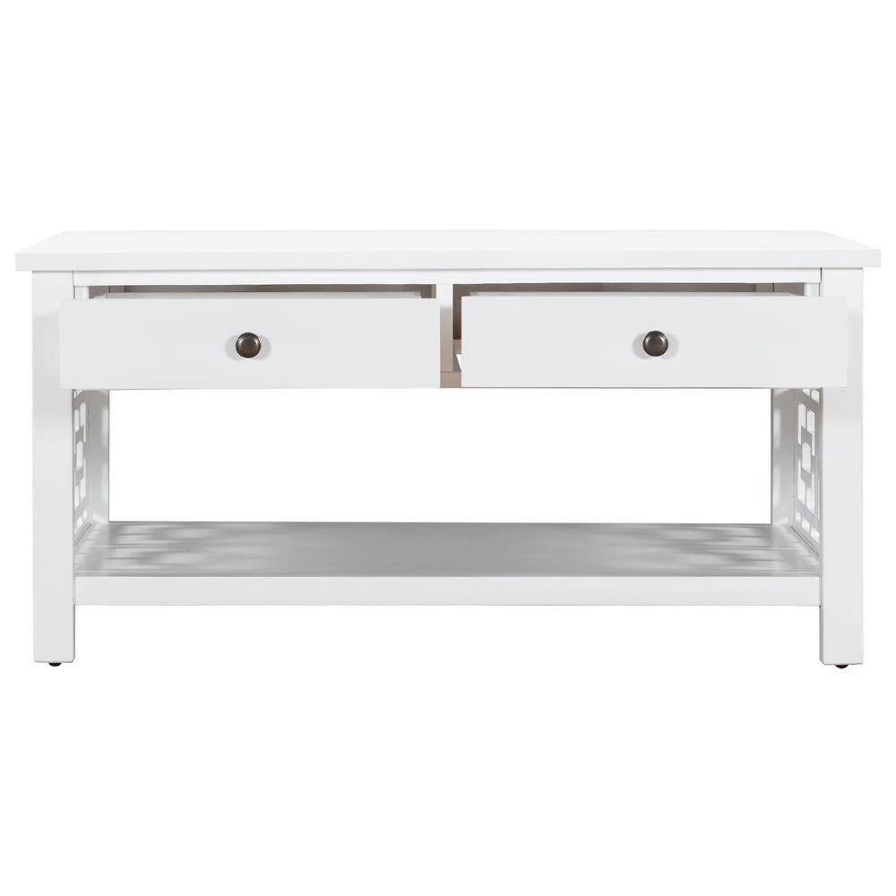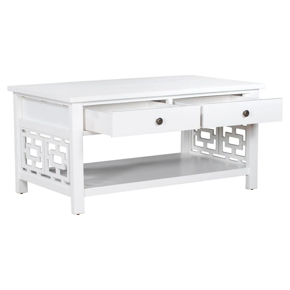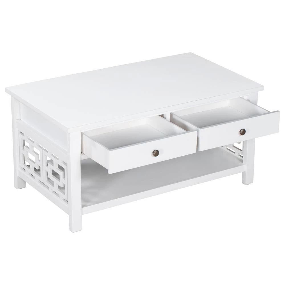 Make your living room more artistic with this coffee table. The white table body exudes an elegant charm. The sides are designed with chic patterns. The lower shelf can be used for storage.