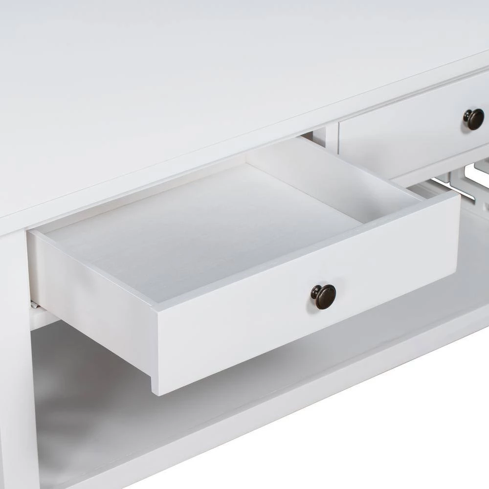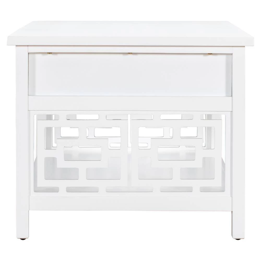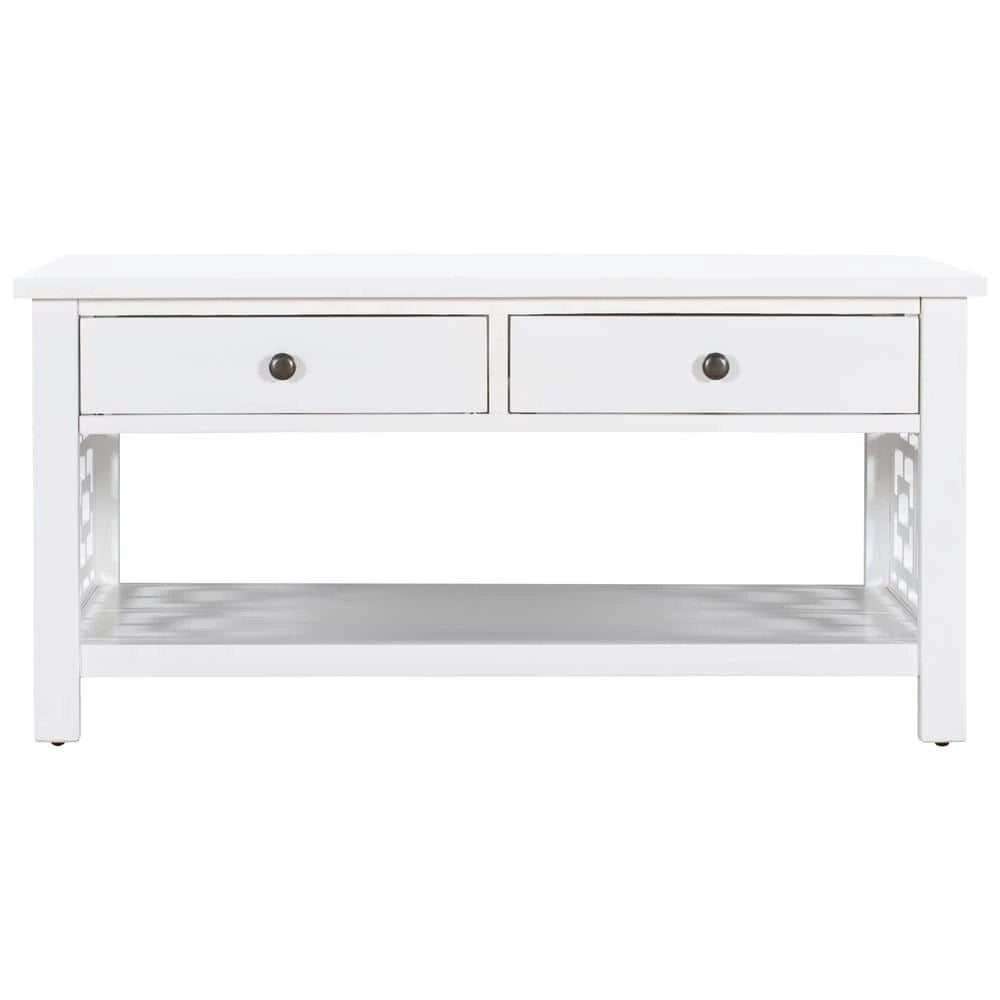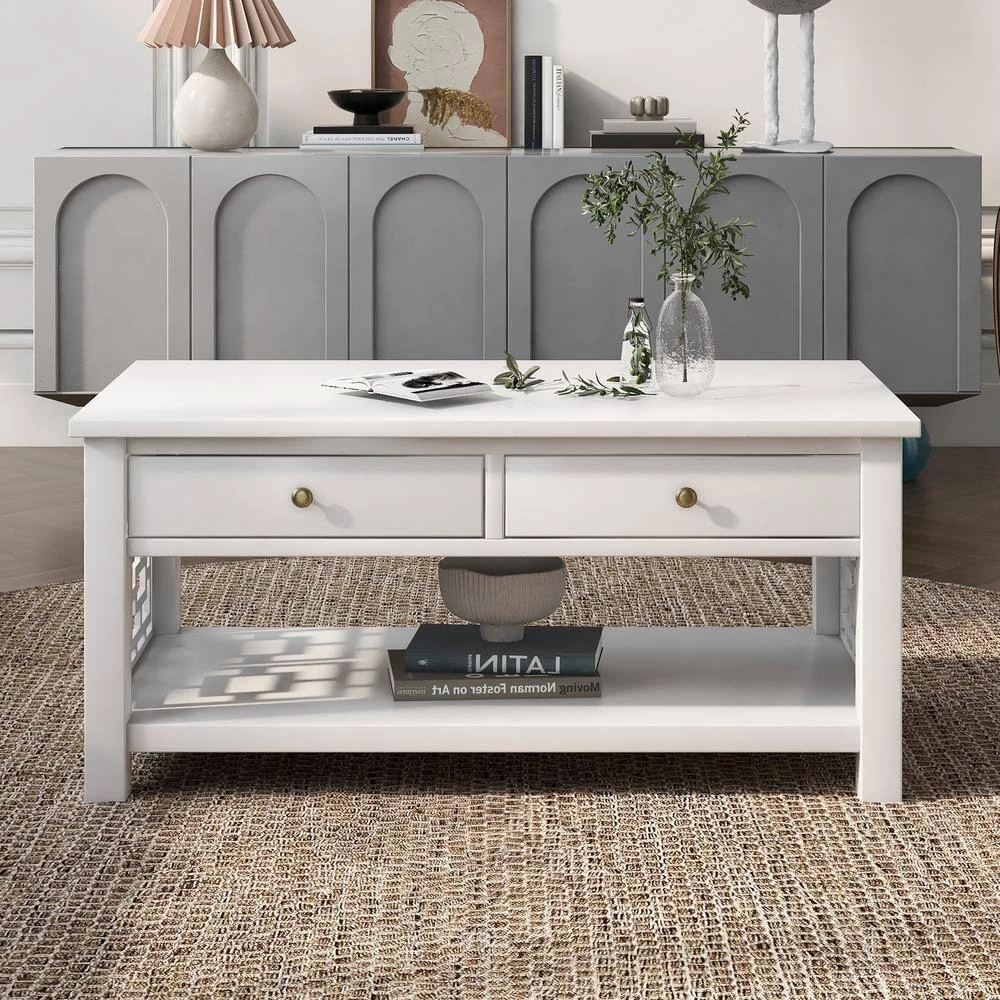 Make your living room more artistic with this coffee table. The white table body exudes an elegant charm. The sides are designed with chic patterns. The lower shelf can be used for storage.
