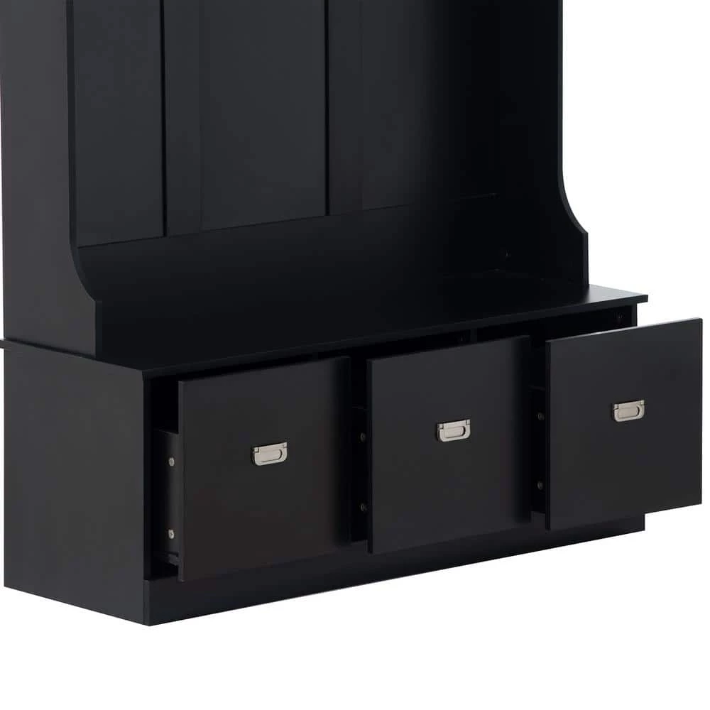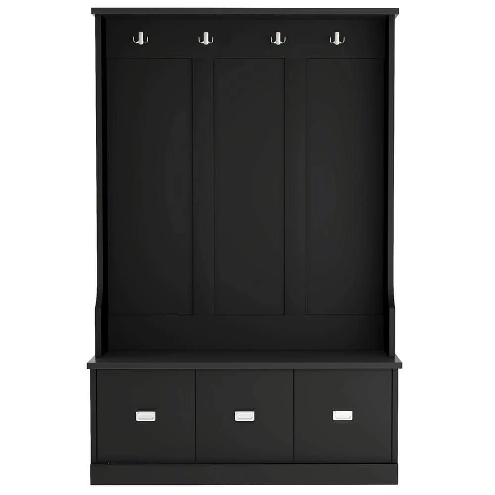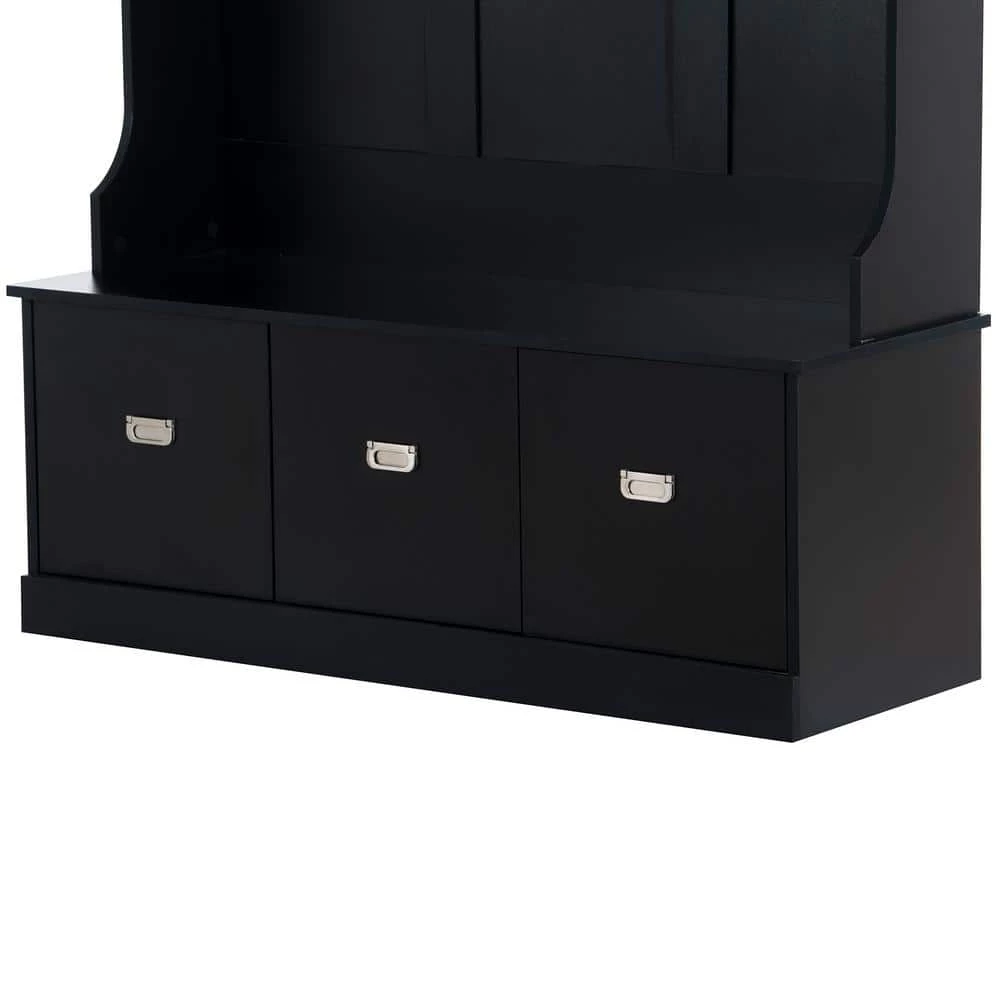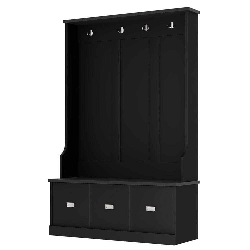 - With 1 top shelf, 4 front hooks, and 1 storage bench with 3 drawers