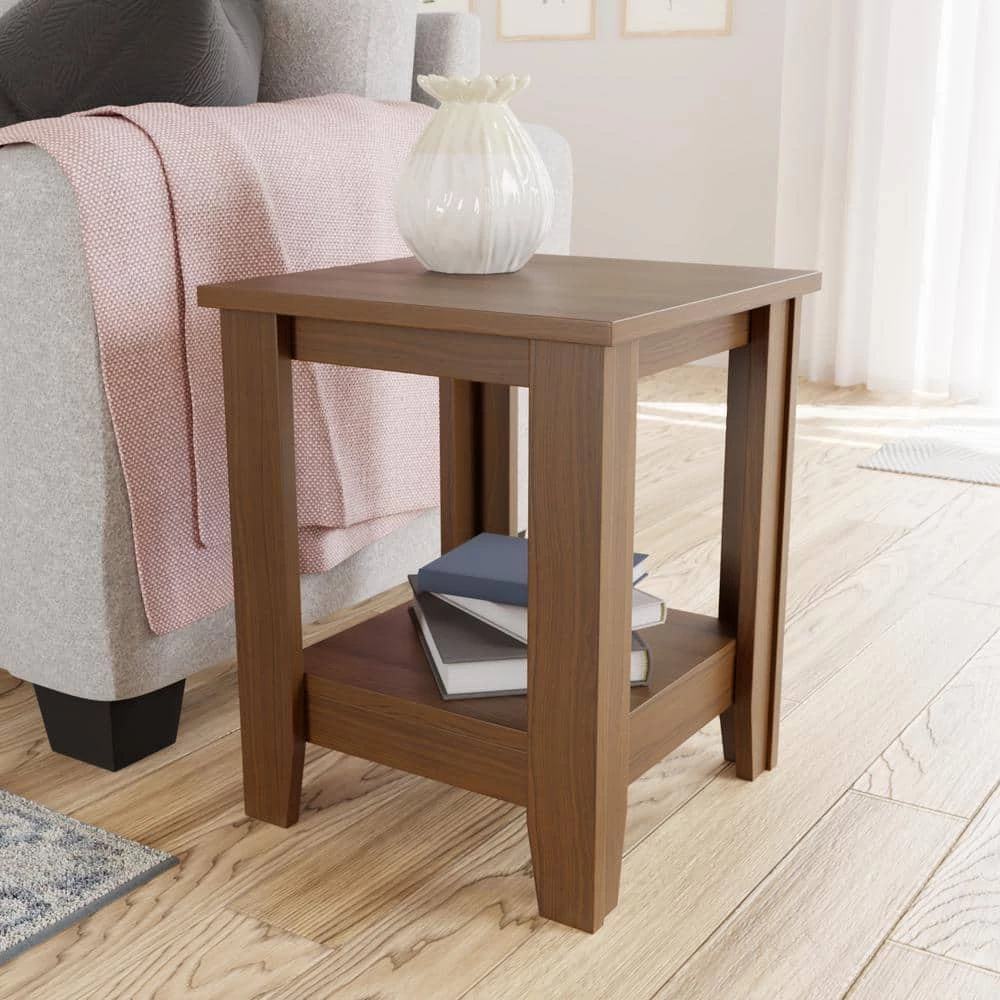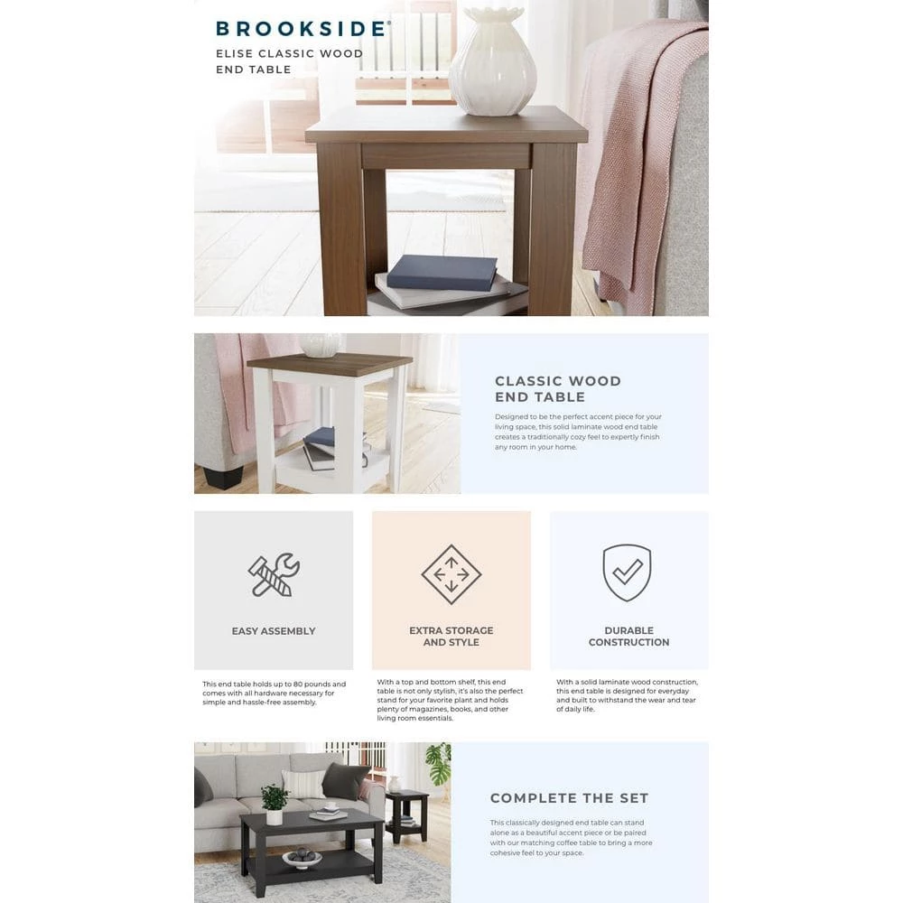 Complete your living room with the Elise Classic Wood Laminate End Table to create a traditionally cozy feel that expertly complements any space. Constructed with durable laminate wood to withstand the wear and tear of a busy life for years to come, this end table is made for real life. Supportive legs are topped with a laminate wood plank and finished with a second shelf underneath to store all those extra little things that pile up. This end table holds up to 80 lbs. and comes with all hardware necessary for simple and hassle-free assembly. Get this traditional end table in Black, Walnut and Gray/White color options to expertly and easily, complete you living space.