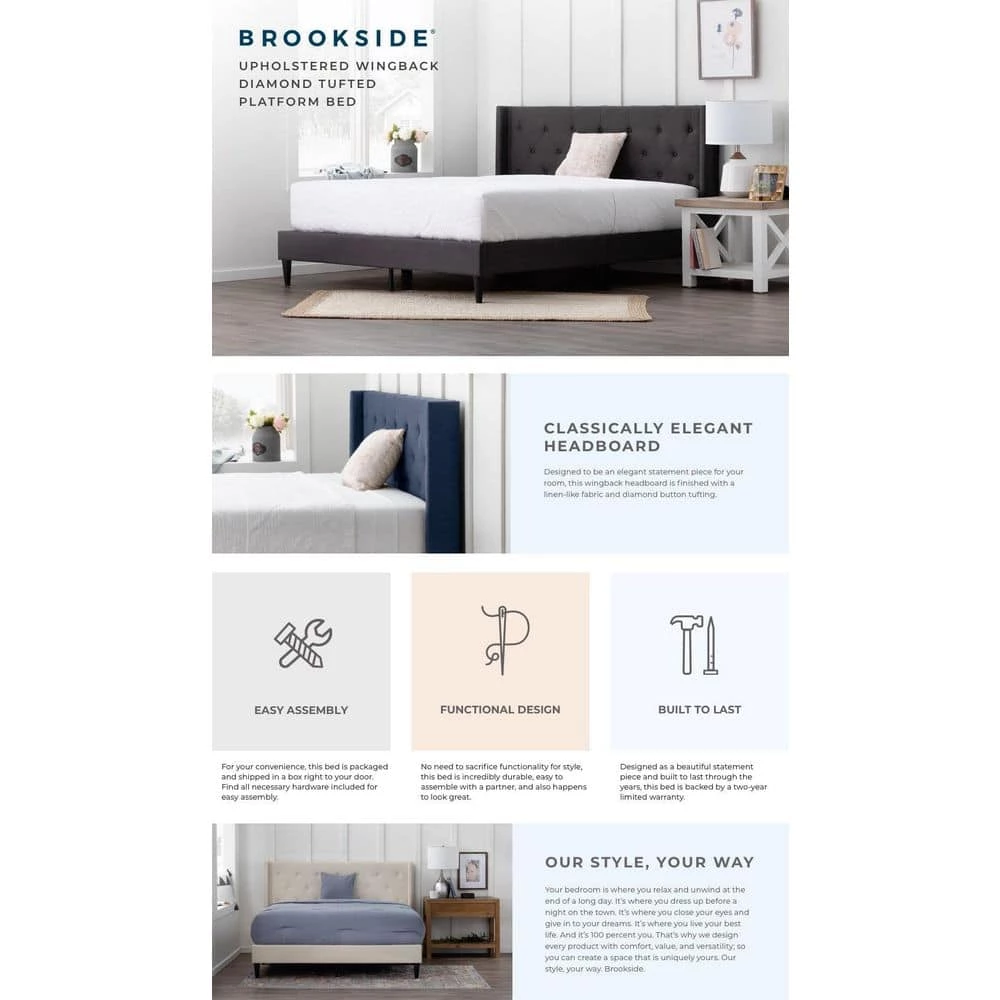 Bring an element of classic style Brookside home design to your bedroom with the Isabelle upholstered wingback diamond tufted platform bed. This queen platform bed frame features thick side and foot rails finished with a diamond tufted headboard with wings. The durable and fashionable upholstered fabric finish is available in Charcoal, Navy, Cream and Stone color options so you can easily match any decor. Platform bed fame with center support is complete with a supportive slat-roll, center metal bed support bar, decorative and sturdy legs, a beautiful padded headboard, and all other necessary hardware. The Brookside bed frame comes shipped in a box with everything you need to easily set it up on your own or with a partner. Plus, it’s backed by a Brookside furniture 2-year limited warranty.