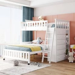 White Twin over Twin Playhouse Bunk Bed with Ladder and Slide(76.5”L x 40.5”W x 71”H) by Polibi