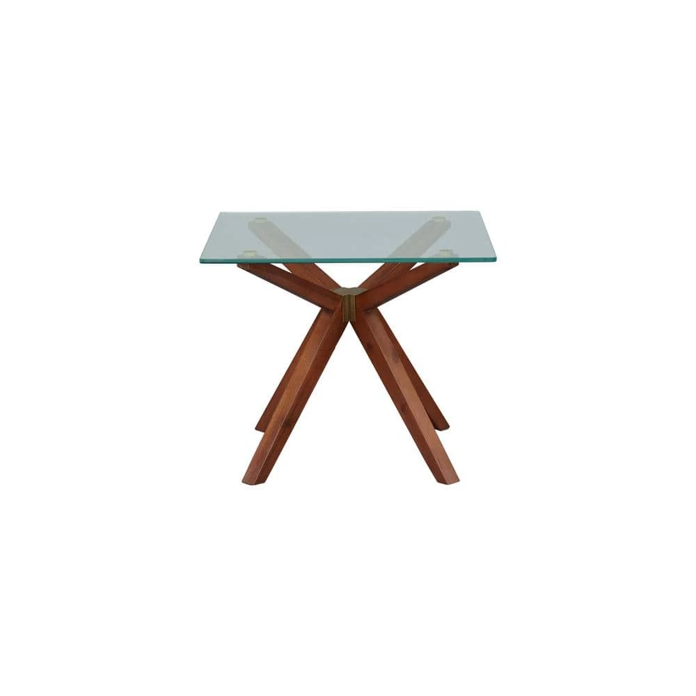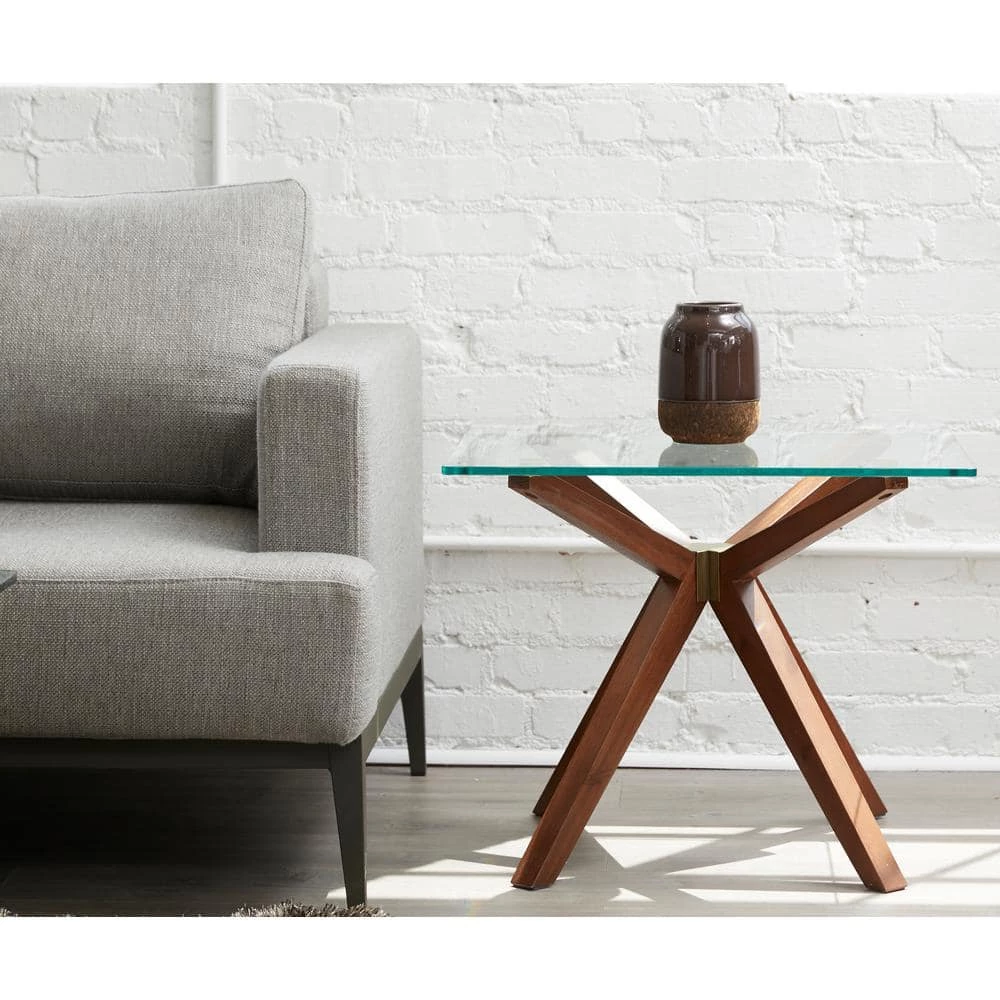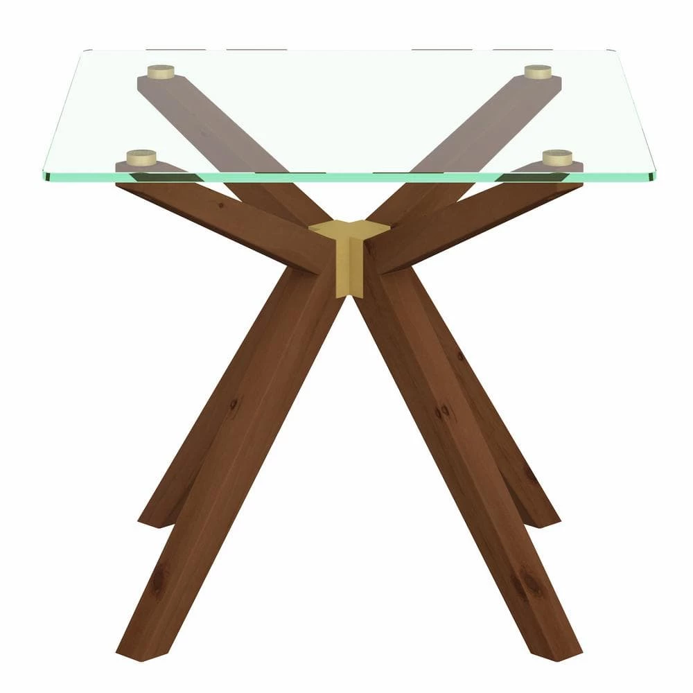 This table embraces the elements of mid-century modern to bring nature-inspired textures and bold, architectural lines to the contemporary living room. Supported by an angled solid wood walnut stained base, rich brass details support the sparkling clear glass top to provide a warm metallic count. Ideal for the living room.