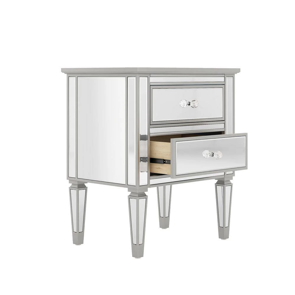 Add elegance to your bedroom with this shiny mirrored horizontal nightstand.Contemporary polished mirror panels make the cabinets dazzling. Arrow-shaped legs give this gleaming stand an even more glamorous look.