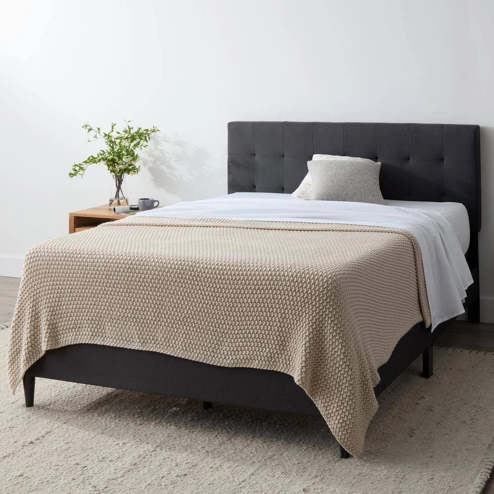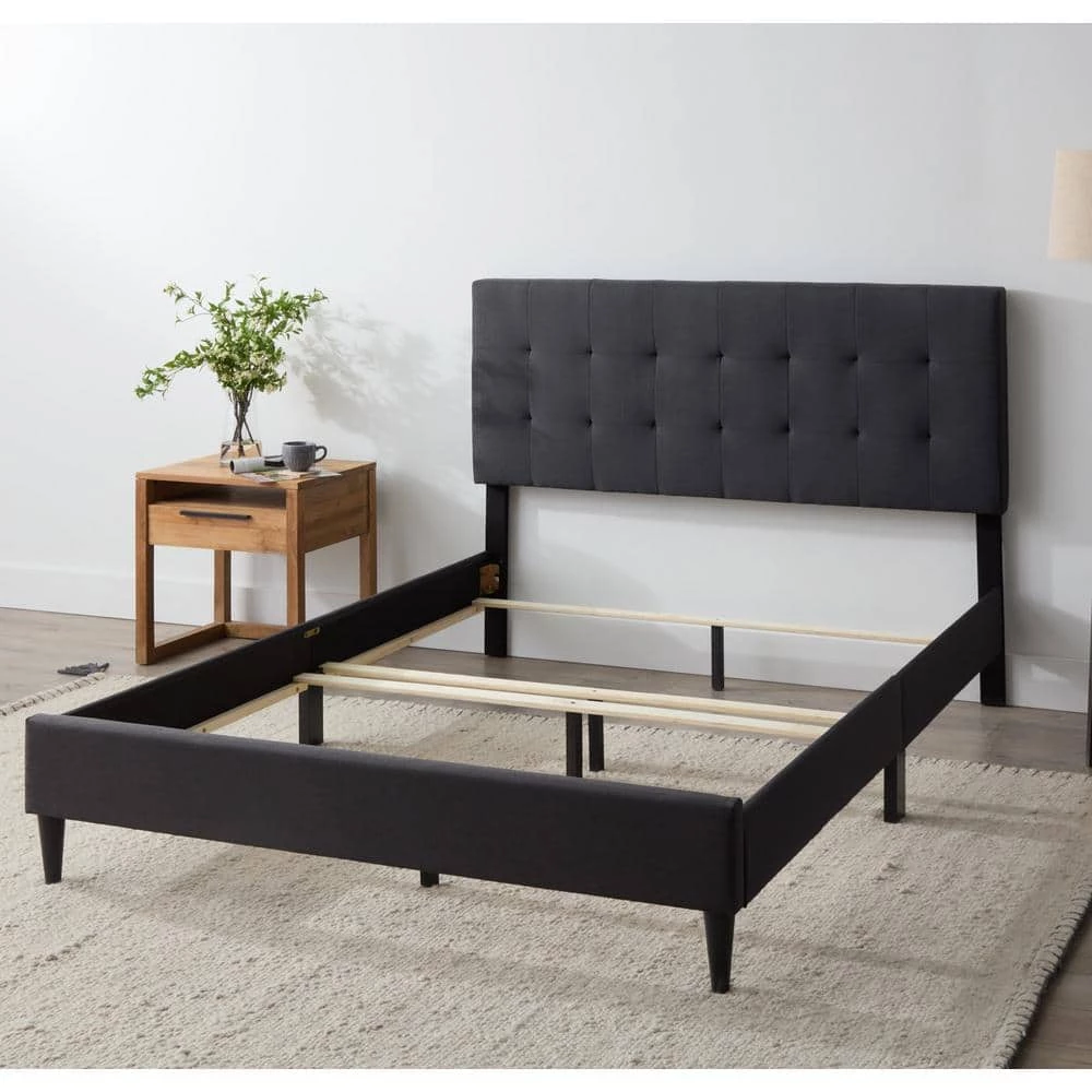 Center your room with this classic and comfortable upholstered platform bed from Brookside. The soft, padded Queen headboard and matching Queen bed frame give your room an upscale look-especially with the elegant, linen-like fabric. With 4-different color choices-Charcoal, Navy, Stone, and Black-this is bedroom furniture that will complement any room. Pair with the mattress of your choice, a supportive box spring, and some fluffy pillows to create the ultimate bedroom retreat.